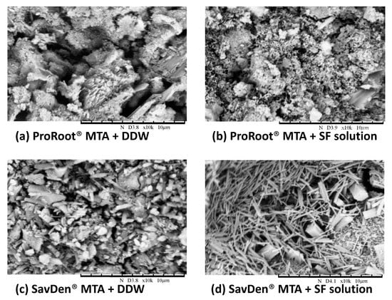 Studies on the microstructures of MTA pastes have given results broadly similar to those on Portland cement pastes due to its use at 70–80% in various MTAs. The particle size and crystallization of cements on the cross-section areas were examined by scanning electron microscopy (SEM). The microstructure of hydrated MTA consists of cubic, needle-like crystals, and porous structures. In Figure 2, the image shows that SavDen® MTA set by the 5 wt% SF solution has more cubic and needle-like morphologies of 2–5 μm in length over the surface of the material, which provides the material an important interlocking of the entire mass. The particle size on the surface of ProRoot® MTA is larger when set by DDW than that of the 5 wt% SF solution.