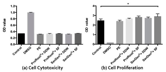 MG-63 osteoblast-like (a) cell cytotoxicity and (b) cell proliferation of ProRoot® white MTA and SavDen® MTA individually set with deionized water (DDW) and 5 wt% SF solution. Three samples (n = 3) were examined for each data point. * Indicates a significant difference (p < 0.05).