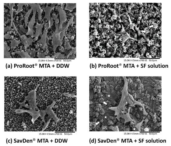 Figure 4 revealed MG-63 cells spreading randomly on the hydrated MTA surface under the scanning electron microscope. On the surface of MTA set by the SF solution, cells were observed with more nuclear protrusions and propagated cytoplasmic extensions, which helped cells to better adhere to the surface. Porous microstructures with acicular crystals were observed in the surface of all four cement groups—(a) ProRoot® MTA + DDW, (b) ProRoot® MTA + SF solution, (c) SavDen® MTA + DDW, and (d) SavDen® MTA + SF solution. Two types of hexagonal crystals were reflected in (c) and (d), which are planar-like structures (marked with arrow) and pillar-like structures (marked with hollow arrow). In addition, acicular sheet-like crystals (marked with star) forming in layers were contained in (d) [28].