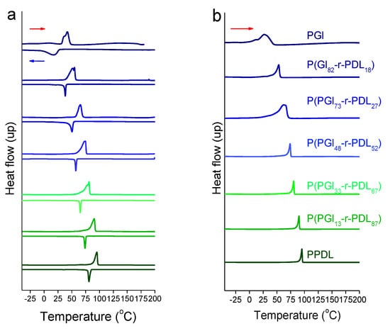 Differential scanning calorimetry (DSC) traces of P(Glx-r-PDLy) copolyesters recorded at the first heating and subsequent cooling (a) and the second heating (b) in the −30 to 200 °C range.