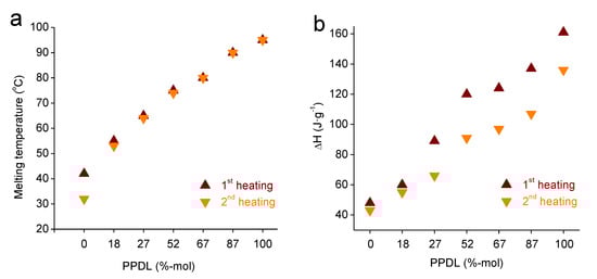 The DSC analysis of the P(Glx-r-PDLy) copolyesters was performed by recording heating–cooling–reheating cycles over the −30 to 200 °C interval. The first heating and cooling traces are shown in Figure 1a and those produced at the second heating are depicted in Figure 1b. The heating traces recorded for PGl and PPDL displayed melting peaks corresponding to Tm at 42 and 95 °C, respectively, according to what is recurrently reported for these poly(macrolactone)s [18]. It was noticed, however, that the signal recorded for PGl was broader and displayed an associated enthalpy much lower than PPDL. Such features indicate that PGl crystallized more defectively and in less extent than PPDL, as it is consistent with the isomerism present in this unsaturated polyester. What is really interesting is that P(Glx-r-PDLy) copolyesters were crystalline for every comonomeric content and that showed linearly increasing melting and enthalpy temperatures over the whole composition range as their content in PDL increased (Figure 2a). A similar trend was observed for the melting of the copolyesters recorded at the second heating with Tm values very close to those registered in the first heating run. These DSC results strongly suggest that Gl and PDL units must be isomorphic at crystallization, a distinguishing property of P(Glx-r-PDLy) copolyesters that deserves further insight. Such a study is currently under course to be published in a forthcoming paper.