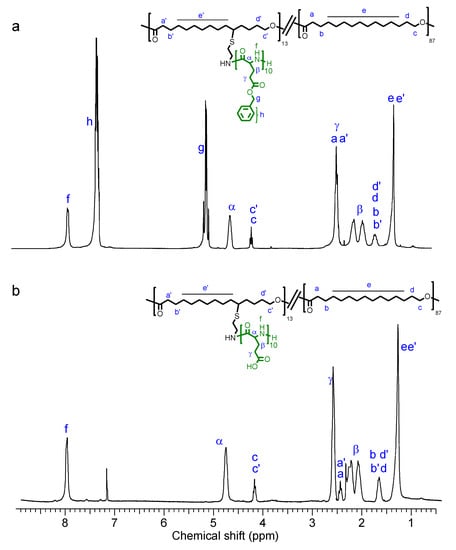 The aminofunctionalized P[(Gl-NH2)x-r-PDLy] copolyesters were then grafted by ROP of the BLG-NCA. Amino groups initiated the grafting reaction with an amino conversion close to 100%. The GPC analysis of the grafted copolymers provided chromatograms consisting essentially in a single peak (other peaks appearing at longer elution times are due to salts added to the eluent, Figure S6 in Supplementary Materials) that confirmed the achievement of the grafting reaction and the absence of free homopolypeptide that could have been generated without the concourse of the amino groups. After acidic treatment of P[(Glx-r-PDLy)–g–(BLG)z] with a TFA/HBr mixture, the COOH functionality of glutamic acid was readily regenerated to render P[(Glx-r-PDLy)–g–(LGlu)z] copolymers which were then duly characterized by NMR. For illustrative purposes, the 1H NMR spectra of P[(Gl13-r-PDL87)–g–(BLG)10] and P[(Gl13-r-PDL87)–g–(LGA)10] are shown in Figure 3, and those registered from P[(Gl48-r-PDL52)–g–(BLG)2] and P[(Gl48-r-PDL52)–g–(LGA)2] are included in the SI file as Figure S7. Area comparison of the 5.15 ppm signal arising from BLG-CH2– with any of the signals characteristic of the copolyester (Figure 3a) demonstrated the success attained in the grafting reaction and allowed a precise estimation of the average length of the polypeptide chains grafted on the polyester. Additionally, the total absence of aromatic signals in the spectra of the deprotected copolymers, which is indicated by the disappearance of the 7.4 ppm signal, was taken as demonstrative that COOH groups had been fully recovered (Figure 3b). Compositions, yields, and average molecular weights of the grafted copolymers are collected in Table 3.