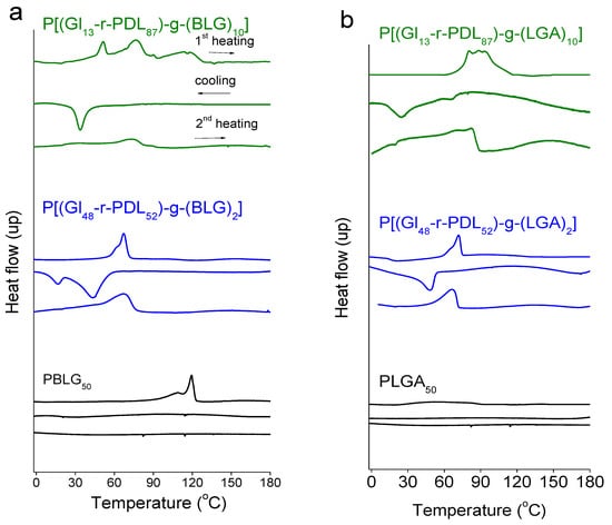 The heating, cooling, and reheating DSC traces recorded from the P[(Glx-r-PDLy)–g–(LGlu)z] copolymers together with those of the parent polypeptides are shown in Figure 4. Flat traces characteristic of amorphous material were invariably produced by PLGA, whereas the first heating trace of PBLG exhibited a sharp endothermal peak that is attributed in the literature to a nonreversible transition involving the rearrangement of the 18/5 to the 7/2 helical conformation [28,29,30]. DSC traces recorded from the copolymers showed, in the four cases, heat exchange peaks characteristic of melting, which are demonstrative of the strong propensity of polymacrolactones to crystallize. In fact, single or multiple endothermic peaks within the 50–90 °C range attributable to melting of PDL/Gl sequences, differing in length or/and monomeric composition, were observed on the first heating traces of the copolymers. The cooling traces showed crystallization exotherms at different supercooling degrees, and their corresponding melting peaks were recovered on the second heating traces. This thermal-crystallization behavior is in agreement with that observed for similar copolyesters obtained by ROP catalyzed by pyridylamidozinc(II) complex [22]. The broad endotherm that is observed exclusively on the first heating trace of P[(Gl13-r-PDL87)–g–(BLG)10] over the 115–120 °C range is attributed to the helical transition undergone by the (BLG)10 side chains. The inobservance of this transition in the other copolymers is according to expectations given the short number or/and charged state of the glutamic acid units in such cases.