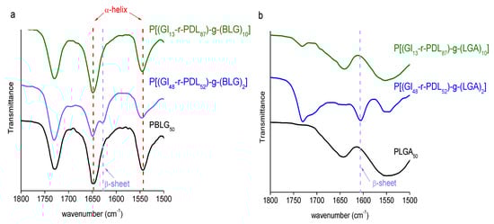 The arrangement adopted by the polypeptide counterpart in P[(Glx-r-PDLy)–g–(LGlu)z] copolymers was examined in detail by FTIR using homopolypeptides poly(γ-benzyl L-glutamate) (PBLG) and poly(L-glutamic acid) (PLGA) as reference. The 1800–1500 cm−1 region of the infrared spectra recorded from samples in the powder form is shown in Figure 5. The amide I and amide II bands appearing with strong intensity at 1655 and 1550 cm−1 on the spectra of both P[(Gl13-r-PDL87)–g–(BLG)10] and PBLG50, respectively, as well as the absence of absorption around 1630 cm−1, are solid indications of the arrangement of the (BLG)10 side chain in α-helix conformation [31,32,33]. On the contrary, the spectra produced by P[(Gl48-r-PDL52)–g–(BLG)2] show a conspicuous peak at 1630 cm−1 consistent with the presence of a considerable amount of the (BLG)2 in β-form. The spectra of the unprotected copolymers showed broad amide bands more according with the polypeptide in a disordered state although the band at 1620 cm−1 observed in the spectrum of P[(Gl48-r-PDL52)–g–(LGA)2] suggests the presence of some β-form in this copolymer. These FTIR results are in good agreement with that is commonly accepted for the conformational properties of polypeptides, i.e., the α-helical conformation is favored by longer amino acid sequences but becomes incompatible with the ionically charged form [34,35]. The effect of temperature on the polypeptide conformation was also examined for the P[(Gl13-r-PDL87)–g–(BLG)10] and P[(Gl48-r-PDL52)–g–(BLG)2] copolymers within the 20–200 °C range (spectra are reproduced in Figure S9 of SI). Neither of the two cases showed apparent spectral changes indicative of α-helix/β-sheet interconversion or helical disruption into the random coil state over the assayed temperature interval. This is in full agreement with the high thermal stability of the α and β forms of polypeptides, which are known to resist temperatures up to well above 200 °C [36].