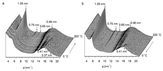 X-ray diffraction (XRD) of the hybrid copolymers in the solid state afforded complementary information in support of the results obtained by both DSC and FTIR. XRD profiles of the P[(Gl13-r-PDL87)–g–(BLG)10] copolymer recorded at real time at temperatures varying over the 0–200 °C range are shown in Figure 6. The 0.41 and 0.37 nm peaks present in the low temperature profiles registered at both heating and cooling are interpreted to arise from the crystal structure of the P(Glx-r-PDLy) copolyesters. According to DSC results, these peaks disappeared at temperatures above melting, i.e., ~75 °C to be replaced by a broad peak at 0.46 nm arising from the disordered state. Additionally, a set of peaks corresponding to lattice spacings roughly related by the 1:√3:2 ratio, (i.e., 1.35, 0.75, and 0.65 nm) was observed. As it has been previously reported on several occasions [37,38,39], such diffraction pattern is indicative of the occurrence of a two-dimensional hexagonal packing of PBLG α-helices with a diameter of approximately 1.5 nm. A detailed inspection of the variation of such pattern with temperature revealed that all three peaks were intensified at high temperatures to practically disappear upon cooling below the temperature at which the polyester crystallized. This behavior, which has been observed before for block copolymers made of PPDL and PBLG [36,37], suggests that melting of the polyester phase favored the building of the polypeptide columnar phase. Results obtained in similar wide/small angle X-ray scattering (WAXS/SAXS) analyses carried out on P[(Gl48-r-PDL52)–g–(BLG)2] are provided in Figure S10 of SI. In this case, the diffraction peaks characteristic of the crystallized polyester observed at low temperatures were not recovered after cooling and no diffraction peaks characteristic of columnar phase were detected. On the other hand, the discrete scattering registered for the deprotected copolymers was limited to the 0.41 and 0.37 nm peaks characteristic of polyester melting. All other signals detected in these profiles were very weak and of difficult interpretation (Figure S11 in SI).
