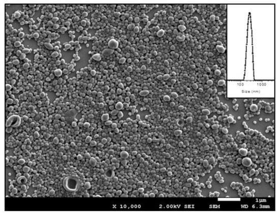 SEM image of nanoparticles made of P[(Gl13-r-PDL87)–g–(BLG)10] copolymer. Inset: dynamic light scattering studies (DLS) profile recorded from the particle suspension. Additional SEM images are available in Figure S12 of SI.