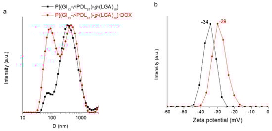 DOX is a well-known amphiphilic drug that is commonly used in cancer therapy [40]. The amino group attached to the sugar moiety of the DOX molecule becomes positively charged at pH below 5 (Figure S14 in SI). DOX hydrochloride (DOX·HCl) has been used in a large number of occasions to test the drug-loading capacity of nanoparticles made of carboxylic polymers that are able to interact electrostatically with the NH3+ group provided that they are located at the particle surface [41,42,43,44,45,46,47]. To assess the potential of P[(Gl13-r-PDL87)–g–(LGA)10] as nanocarrier, this copolymer was mixed with DOX·HCl in water at different LGA:drug molar ratios (1:0.4, 1:0.15, and 1:0.07), and the resulting DOX-loaded micelles were examined by DLS. The results found for 1.25 and 3 mg·mL−1 copolymer concentrations with an LGA:drug ratio of 1:0.4 are shown in Figure 8. The copolymer particles without DOX showed an essentially unimodal distribution of sizes with an average diameter of 250 nm. On the contrary, the DLS of the DOX-loaded particles revealed a bimodal distribution with average diameters of about 80–400 nm. The negative zeta potential of the particles decreased upon loading as a logical consequence of the partial neutralization of the negative charge that takes place by electrostatic interaction with DOX.