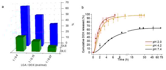 The suitability of P[(Gl13-r-PDL87)–g–(LGA)10] for DOX loading was assessed by estimating the drug-loading efficiency (DLE) and drug-loading content (DLC) for the three LGA:drug molar ratios tested in this study. The bar plot in Figure 9a shows the DLE and DLC values estimated for the three cases. Both parameters increased with the increasing amount of added DOX to attain values of 66% and 21%, respectively, for the LGA:DOX = 1:0.4, which was the lowest ratio assayed. This composition was chosen for evaluating the ability of P[(Gl13-r-PDL87)–g–(LGA)10]·DOX to deliver the drug as well as to assess the response of the system to pH changes. The DOX-releasing profiles obtained upon incubation of this conjugate at pH 2.0, 4.2, and 7.4 are compared in Figure 9b. In both cases, DOX was delivered following an asymptotic function of time without any detected burst confirming that all the loaded DOX was chemically attached to the copolymer. The maximum amount of delivered DOX under neutral conditions was about 60%, and it was attained after one day of incubation. On the other hand, more than 95% of DOX was released in 10 and 6 h when the loaded particles were incubated at pH 4.2 and 2.0, respectively. The observed differences must be attributed to the notable decrease in the ionization degree of the LGA moieties that is produced at acidic pH with the subsequent disruption of the copolymer–drug electrostatic interactions.