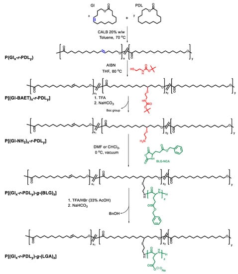The presence of double bonds in the P(Glx-r-PDLy) copolyesters made them suitable for the preparation of graft copolymers. As it is depicted in Scheme 1, amino functionalities were firstly inserted in the Gl units by thiol-ene reaction with 2-(Boc-amino)ethanethiol (BAET) followed by treatment with TFA to remove the Boc-protecting group. This method has been before proven to be effective for the preparation of multiaminated PGl used as macroinitiator for grafting with other amino acids by NCA ROP [21,27]. The evolution of the addition reaction was followed by 1H NMR that allowed determining the coupling efficiency of BAET, which was found to be 90% and 50% for P[(Gl13-r-PDL87) and P[(Gl48-r-PDL52), respectively (Figure S5 in Supplementary Materials).