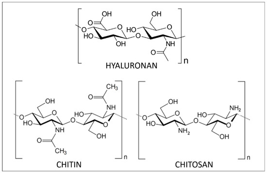 Hyaluronic acid (HA, Figure 1), also called hyaluronan, is a non-sulfated GAG. It is a linear polysaccharide that assures important biological functions in bacteria and mammalian tissues [11]. In terms of structure, HA is composed of repeating disaccharide units linked by β-(1,4) and β-(1,3) bonds. Its molecular weight (MW) depends on its origin in the organism, varying from 5 to 20,000 kg/mol. It is synthesized by transmembrane HA synthases and degraded by hyaluronidases.
