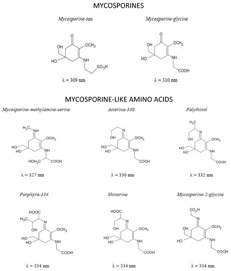In this section, special attention is paid to the marine secondary metabolites that are mycosporines and mycosporines-like amino acids (altogether abbreviated here as MAAs).