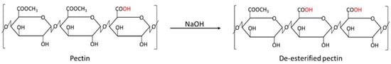- Hunter, J.L.; Wicker, L. De-esterification of pectin by alkali, plant and fungal pectinmethylesterases and effect on molecular weight. J. Sci. Food Agric. 2005, 85, 2243–2248. [Google Scholar] [CrossRef]