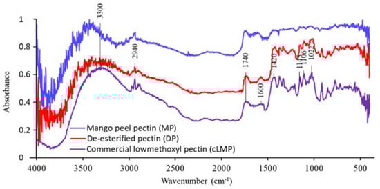 | Mango peel pectin (MP) | 12.46 ± 0.52 | 75.14 ± 2.09 | 79.02 ± 2.84 |