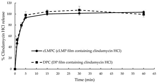 | cLMPC (cLMP film containing clindamycin HCl equivalent to clindamycin base 1%) | 41.11 ± 0.33 a | 76.30 ± 0.98 a |