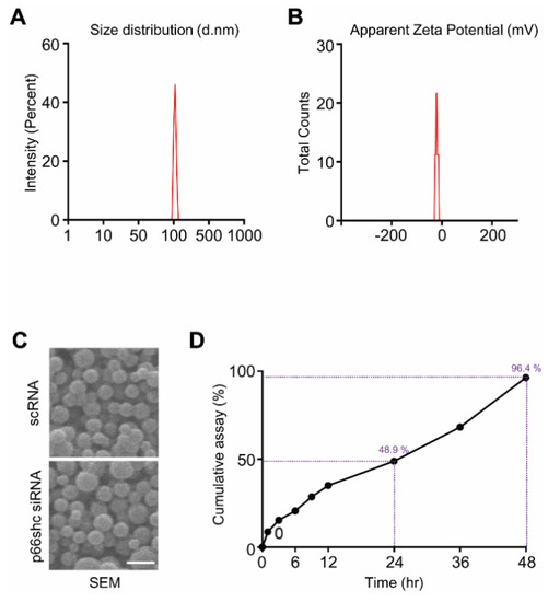 p66shc siRNA-PLGA NPs were prepared by sonication using the W/O/W double emulsion method to encapsulate hydrophilic siRNA. The average size and zeta potential were 183.7 ± 72.21 nm and 41.1 ± 4.81 mV, respectively (Figure 1A,B). Scanning electron microscopy showed that both p66shc siRNA-PLGA NPs and scrambled siRNA (scRNA)-PLGA NP were spheroids (Figure 1C). A siRNA release assay of NPs was conducted in PBS, and the p66shc siRNA-PLGA NPs showed relatively a stable release for 48 h: the cumulative siRNA release was 96.4% within 48 h (Figure 1D). In addition, we found that the encapsulation efficiency of p66shc siRNA-PLGA NPs was 32.3%.