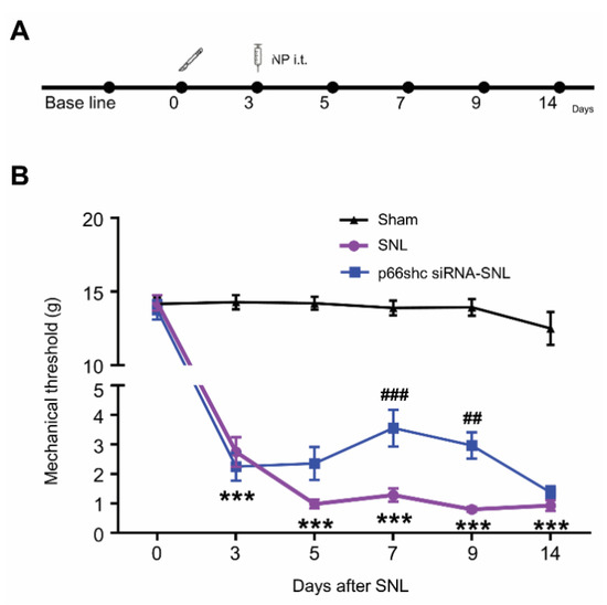 The degree of pain confirmed by the mechanical threshold after spinal nerve ligation (SNL). (A) experimental timeline of this study; (B) After three days of SNL-induced neuropathic pain, the mechanical threshold was identified using the von Frey filament test to confirm the analgesic effect of p66shc siRNA-PLGA NPs (n = 6 in each group). Data are expressed as means ± SEM (two-way ANOVA with Dunnett’s post hoc test, *** p < 0.001 vs. sham group, ### p < 0.001, ## p < 0.01 vs. SNL group.