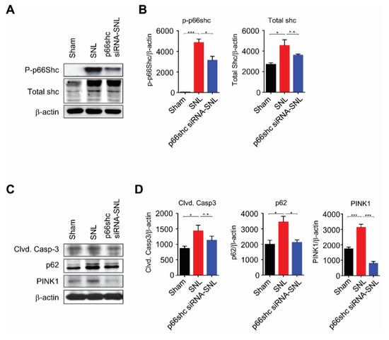 p66shc siRNA-PLGA NPs reduced the protein levels of cleaved caspase-3, p62, and PINK1 in the ipsilateral spinal cord at 7 days after SNL. (A,B) phosphorylation of p66shc was decreased after treatment with p66shc siRNA-PLGA NPs; (C,D) SNL-induced increases in cleaved caspase-3, p62, and PINK1 protein levels were significantly attenuated in the p66shc siRNA-SNL group. β-actin was used as a loading control. Data are expressed as means ± SEM (unpaired Student’s t-test, *** p < 0.001, ** p < 0.01, * p < 0.05 vs. sham or SNL group).