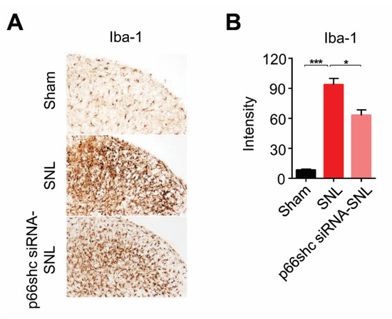 It has been well known that microglia were proliferated and activated in the spinal cord, and that activated microglia could mediate the neuroinflammatory process in the spinal cord, which contribute to the development and maintenance of neuropathic pain [27,28,32,33]. Therefore, in this study, we examined the activation of microglia in the ipsilateral dorsal horn of the L5 spinal cord following SNL. In the SNL group, the number of Iba-1-immunoreactive microglia was markedly increased in the ipsilateral dorsal horn of the L5 spinal cord at seven days after SNL. On the other hand, the number of Iba-1-immunoreactive microglia was significantly decreased in the p66shc siRNA-SNL group compared with the SNL group (Figure 4).