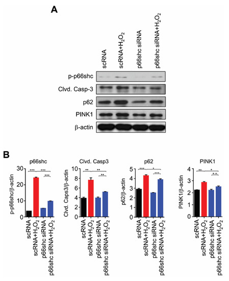 Next, to verify the role of p66shc, we examined whether p66shc siRNA attenuates the expression of markers of apoptosis, autophagy, and mitophagy in H2O2-stimulated HT22 cells. First, we confirmed that the marked increase in the p-p66shc level in the scRNA+H2O2 group significantly decreased by p66shc siRNA treatment: p-p66shc level of p66shc siRNA-treated group was similar to that of the scRNA-treated group (as control group) (Figure 5). In addition, we found that H2O2-mediated increases in cleaved caspase-3, p62, and PINK1 protein levels were significantly inhibited by p66shc siRNA treatment (Figure 5).