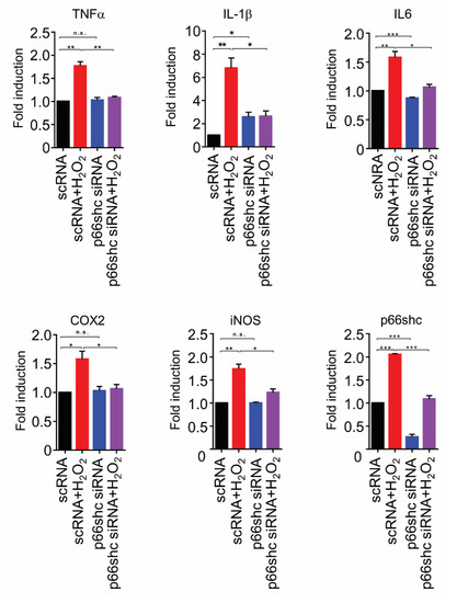 3.6. Suppression of Transcription of Proinflammatory Mediators by p66shc siRNA in H2O2-Stimulated HT22 Cells