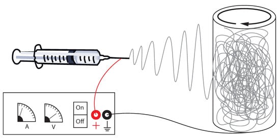Schematic of the electrospinning set-up used to prepare fibrous PU/CNC mats. A high-voltage power supply is used to apply a voltage of about 10 kV between a syringe that contains a PU/CNC solution in DMF and a cylindrical aluminum collector. Rotation of the collector facilitates production of fibrous mats of homogeneous thickness.