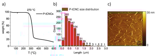 P-tCNCs produced via phosphoric acid hydrolysis conserve 95% of their initial mass at 270 °C under air conditions as determined by TGA (Figure 2a). They are significantly more thermally stable than tunicate CNCs extracted using sulfuric acid hydrolysis, which degrade around 180 °C []. Statistical analysis of individual, well-dispersed P-tCNCs imaged by AFM gives an average length of 678 ± 408 nm (Figure 2b,c). AFM imaging also shows a population of short P-tCNCs, which may arise from the comparably long hydrolysis reaction time and the relatively high dispersity of the raw tunicate cellulose.