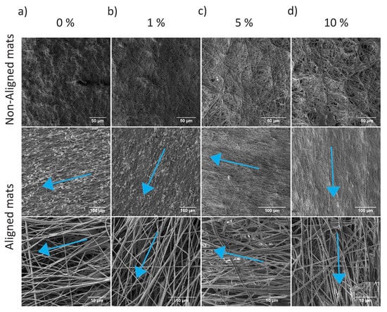 SEM images of electrospun PU/P-tCNC mats collected on a rotating drum at either 11 m/min (top row) or 330 m/min (bottom row), the latter resulting in the alignment of fibers within the mats. The blue arrows indicate the rotational direction of the collector.