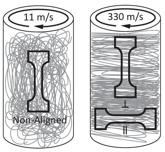Among the various available polymer matrices, polyurethanes (PUs) have received particular attention. This is reflected in numerous studies involving PU/CNC nanocomposites, reporting strong mechanical reinforcement [,,,,,,]. Most PUs are microphase-separated thermoplastic elastomers consisting of a rubbery phase formed by a non-crystallizing telechelic polymer with a low glass transition temperature and hard segments composed of diisocyanate and diols that serve as physical cross-links. PUs typically offer high strength and elasticity, as well as molecular tunability [,]. PU/CNC nanocomposites can be processed by melt-spinning [,], melt-mixing followed by compression molding [,,,,,,], and solvent casting [,,,,]. PU/CNC nanocomposites electrospun into fibrous mats were only demonstrated very recently [,]. Electrospun CNC-reinforced fibrous PU mats are, however, promising for a wide range of applications, for example in tissue engineering and membrane filtration []. Electrospun CNC-based nanocomposites have also been demonstrated employing polystyrene [,], poly(lactic acid) [], polycaprolactone [], and poly(ethylene oxide) [,,] matrices. Most studies focused mainly on the effect of various processing parameters on the diameter and morphology of the fibers within electrospun mats, while only very few were concerned with enhancing the mechanical properties of the mats through fiber alignment or CNC orientation. In particular, the contribution of CNC alignment to the reinforcement of (aligned) fibrous mats has only been scarcely studied. Progress in this direction helps to identify design strategies for stronger fibrous nanocomposite mats and increase their utility.