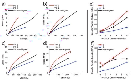 (a) Stress–strain curves of electrospun fibrous mats with: (a) 0 wt% P-tCNCs; (b) 1 wt% P-tCNCs; (c) 5 wt% P-tCNCs; and (d) 10 wt% P-tCNCs in PU with different fiber orientations, showing the superior mechanical properties of fibrous mats with parallel fiber alignment. (e) Specific Young’s modulus and (f) specific tensile strength normalized using the densities listed in Table 3, showing an increase in mechanical properties with increasing P-tCNC concentration. Error bars are the same size or smaller than the symbols.