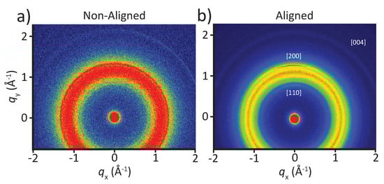 Figure 6 shows 2D WAXS patterns of PU/P-tCNC nanocomposite mats for a P-tCNC concentration of 10 wt%, consisting of either aligned or non-aligned fibers. Only the [110], [200], and [004] peaks of the P-tCNC crystal structure were observed in these WAXS patterns, while other less intense peaks are hidden by the overlapping, intense PU peak. Each of these three P-tCNC peaks shows an anisotropic intensity distribution for mats with aligned fibers (Figure 6b), indicating a preferred orientation of the P-tCNCs within the electrospun fibrous mat. On the other hand, for the mats with non-aligned fibers, all P-tCNC peaks show a uniform intensity distribution, indicating an isotropic orientation of P-tCNCs within the mat, as shown in Figure 6a.