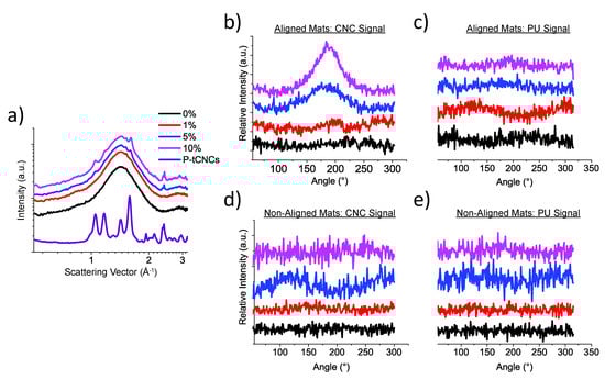 Scattering profiles were obtained from the 2D WAXS patterns by azimuthal integration, as shown in Figure 7a. The reflections corresponding to CNCs were observed for sufficiently high CNC concentrations. The peaks at q = 1.65 Å−1 (P-tCNCs) and q = 1.46 Å−1 (PU) were considered to determine the orientation of P-tCNCs and PU hard segments. The P-tCNC and PU peaks of electrospun fibrous mats with non-aligned fibers did not exhibit any azimuthal dependence, irrespective of the P-tCNC concentration (Figure 7d,e), indicating the entirely isotropic nature of the crystals in these mats. This behavior is in contrast to the electrospun fibrous mats with aligned fibers, where the [200] P-tCNC peak shows an intensity maximum at 180° for P-tCNC concentrations of 5 and 10 wt% in the PU matrix (Figure 7b), corresponding to a preferred orientation of the P-tCNCs within these mats. This observation is particularly interesting as the PU reflection in the very same mats (i.e., those with aligned fibers) was found to be isotropic (Figure 7c), implying an insignificant or possibly entirely isotropic orientation of PU hard segments in electrospun fibrous mats, irrespective of the fiber orientation.