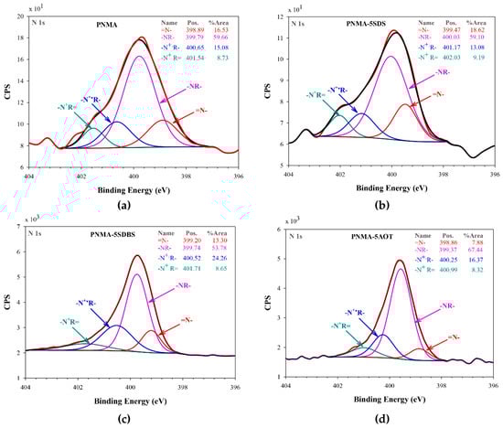 High-resolution N 1s curve fitting of: (a) PNMA; (b) PNMA-5SDS; (c) PNMA-5SDBS; and (d) PNMA-5AOT.