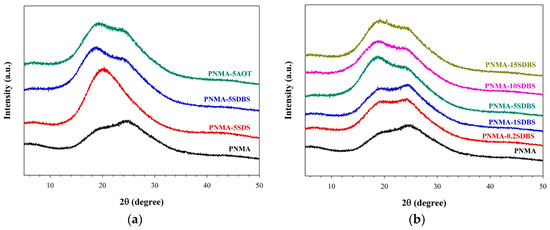 The XRD patterns of PNMA synthesized without surfactant, with the three anionic surfactants at 5 CMC, and with SDBS at various concentrations are shown in Figure 3a,b, respectively. The PNMA synthesized without surfactant shows the three broad peaks at 2θ~19.6°, 25.6°, and 44.4° corresponding to the characteristic peaks of PNMA, consistent with Li and co-workers [48], and Lu and co-workers [37]. The broad peaks herein exhibit the amorphous nature of the synthesized PNMA.