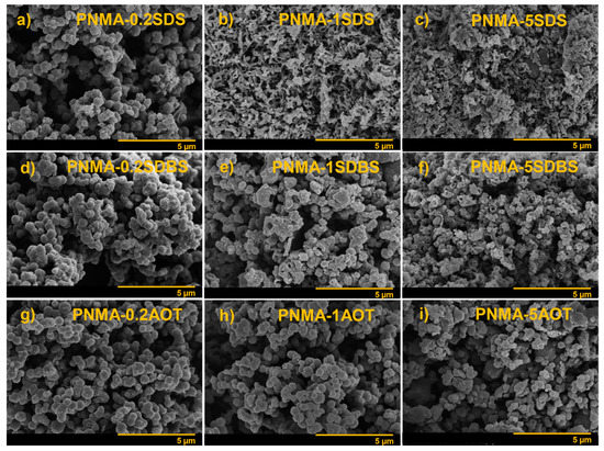 Morphology of PNMA synthesized in different anionic surfactants and at various concentrations: (a) PNMA-0.2SDS; (b) PNMA-1SDS; (c) PNMA-5SDS; (d) PNMA-0.2SDBS; (e) PNMA-1SDBS; (f) PNMA-5SDBS; (g) PNMA-0.2AOT; (h) PNMA-1AOT; and (i) PNMA-5AOT.