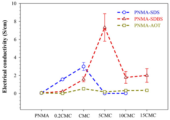 The effects of different anionic surfactants and concentrations on electrical conductivity (σ) are shown in Figure 5 and Table 1. The σ levels of PNMA synthesized with different surfactants at 5 CMC can be arranged in the order of SDBS > AOT > SDS. σ of PNMA synthesized without surfactant is higher than PNMA synthesized with SDS at 5 CMC. Even though the sulfate head group (SO42−) of SDS molecule has a stronger charge density compared to the sulfonate head group (SO32−) of SDBS molecule, the ionic head group of SDS seems to have a minor effect on electrical conductivity when compared to SDBS. This might have resulted from the screening effect of HCl on surfactant charges and the structural characteristic of SDBS molecule. The latter case is due to the SDBS Π-Π interaction and the PNMA-SDBS Π-Π interaction, as well as the small size of SDBS molecules can promote the incorporation of SDBS into PNMA chains, leading to the enhancement of σ. The hollow particles of PNMA synthesized with SDBS yield the higher σ (7.33 ± 1.53 S cm−1) than a spherical shape of PNMA synthesized with AOT and without surfactants, as well as the irregular shape of PNMA synthesized with SDS. Notably, the particle shapes in this work affect σ. The hollow shape of PNMA synthesized with SDBS contributes to a larger surface area for electron transfer than the spherical and irregular particles of PNMA synthesized with AOT and SDS, respectively, resulting in the higher σ.