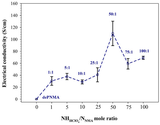 The electrical conductivities of PNMA before and after the de-doping steps are listed in Table 1. PNMA after the de-doping process (dePNMA) possesses 5 orders of magnitude decrease in σ (from 7.33 ± 1.53 S cm−1 of PNMA-5SDBS to (4.47 ± 0.92) × 10−6 S cm−1 of dePNMA), indicating the successful de-doping step. The σ values of re-doped PNMA (dPNMA) at various doping mole ratios are shown in Figure 7 and Table 1. The highest σ at the doping mole ratio of 50:1 is 109.84 ± 20.44 S cm−1, an order of magnitude higher than PNMA before the de-doping step (PNMA-5SDBS) as shown in Table 1. The increment in the numbers of charge carriers (i.e., polaron and bipolaron structures) and the electron compensation by ClO4− molecules to balance the charge after the re-doping step, as verified by the doping level from XPS, produce not only the higher charge carriers but also the higher charge mobility contributing to the increase σ. The σ values at the /NNMA mole ratios above 50:1 decrease before reaching nearly constant values at the doping mole ratios between 75:1 to 100:1. This might have resulted from the electrostatic repulsion between the excessive amount of ClO4- molecules, as verified by the decrease in the doping level from XPS. In addition, the morphologies after the re-doping process support the electrical conductivity decrease. The particle agglomeration into a flake-like structure (Figure 6f) at the doping mole ratio higher than 50:1 limits the electron transfer due to a decrease in the surface area, resulting in a lower σ.