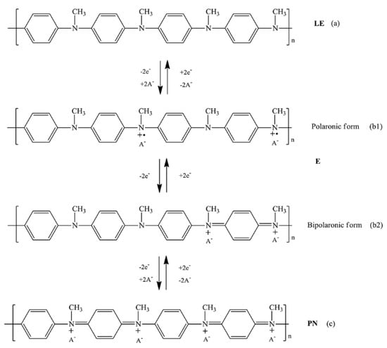 Conductive polymers (CPs) are a class of conjugated organic polymers comprising alternating single and double bonds along their main chains, enabling the electron delocalization along the polymer backbones. Among various CPs, polyaniline (PANI) has acquired the most attention. Nevertheless, its poor solubility in organic solvents is a limitation of PANI in various applications. A PANI derivative namely poly(N-methylaniline) (PNMA) contains a methyl substituent at the nitrogen heteroatom which contributes to an increase in solubility in organic solvents. The PNMA three redox states are the fully reduced leucoemeraldine form (LE), the conducting emeraldine form (E), and the fully oxidized pernigraniline form (PE) [13] (Scheme 1). Nonetheless, the electrical conductivity (σ) of PANI derivatives is still low relative to the unsubstituted PANI [14]. Generally, CPs in the neutral state possess very low electrical conductivity in the insulator regime of ca. 10−10 to 10−5 S cm−1. However, the electrical conductivity can be boosted into the metallic regime with electrical conductivity values between 1 to 104 S cm−1 by the oxidation or the reduction of the conjugated main chains, a process called doping [15]. Depending on the dopant type, the doping process can be divided into the p-type and n-type dopings. In the p-type doping (oxidative doping), the dopant withdraws electrons from the polymer and creates a defect electron (hole) in the polymer backbone. In contrast, the n-type dopant adds electrons into the polymer (reduction) and increases the electron density in the polymer backbone [16,17]. Therefore, the enhancement of electrical conductivity (σ) can be tailored by tuning the density and mobility of charge carriers (holes or electrons) via doping [16].