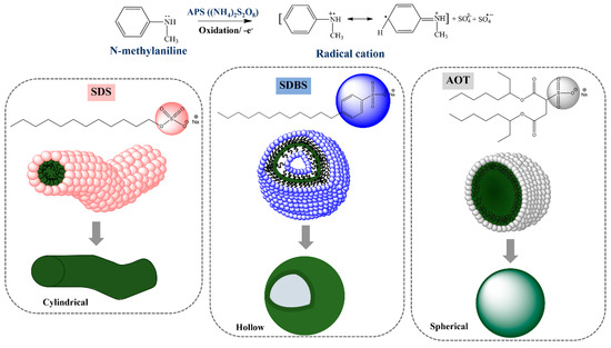 - Direksilp, C.; Sirivat, A. Tunable size and shape of conductive poly(N-methylaniline) based on surfactant template and doping. Polym. Int. 2019, 68, 1042–1053. [Google Scholar] [CrossRef]