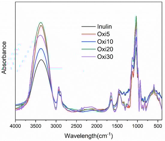 About 2 mg each of dried raw inulin and the modified samples Oxi5, Oxi10, Oxi20, and Oxi30 samples with different degrees of oxidation was properly mixed with 100 mg of FTIR grade KBr powder to form a pellet; then, the FTIR spectra were obtained using a Shimadzu IR Prestige-21 FTIR 8400 spectrophotometer (Kyoto, Japan). All the spectra were obtained after 128 scans in the range of 4000–400 cm−1.