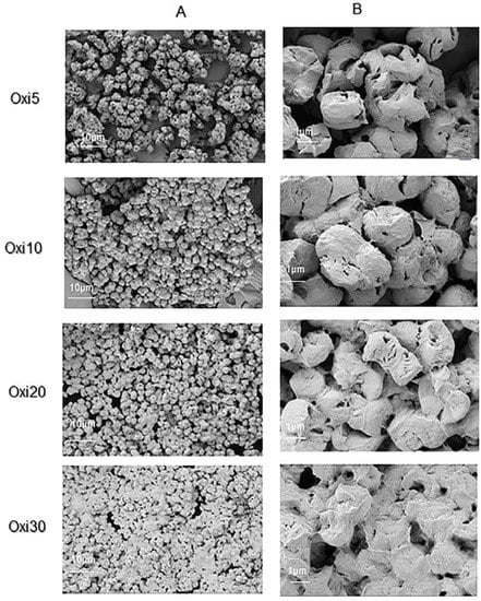 Figure 3A,B shows the SEM of the native inulin; as reported in the literature, the native unmodified inulin appears as a cluster of spherical smooth aggregates, which is expected for spray-dried powders [53,54]. In contrast to inulin, there was a remarkable change in the surface structure of all the modified inulin samples, irrespective of the degree of oxidation (Figure 4A,B). The gradual change in surface morphology might be attributed to the fact that the oxidizing agent diffuses from the surface into the inulin microcrystal. From the SEM, as the oxidation progress, there is clear evidence of surface defects such as the conglutination of the inulin aggregates. In addition, the oxidized samples are characterized by the gradual destruction of the smooth spherical shape of inulin, possibly suggesting that oxidation starts at the surface [55]. As the ratio of sodium periodate used for the oxidation increases, there was evidence of the smooth surface of inulin changing to the rough surface characterized by larger pores compared to native inulin.