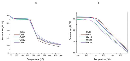 (A,B) Thermograms of unmodified raw inulin and Oxi5, Oxi10, Oxi20, and Oxi30 samples.