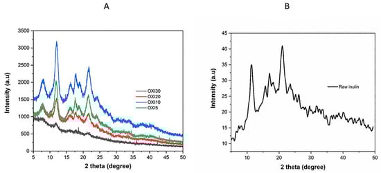 (A) XRD spectra of Oxi5, Oxi10, Oxi20, and Oxi30 samples and (B) raw inulin.