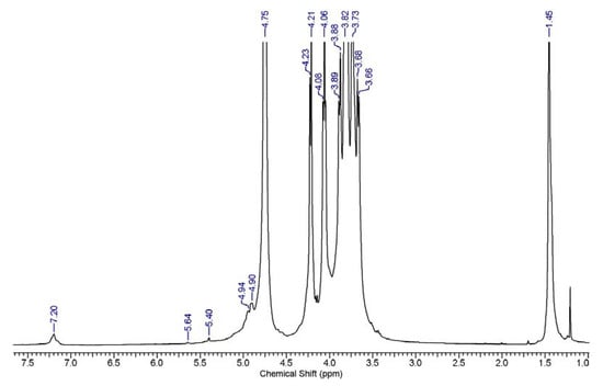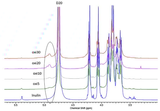 In the case of inulin oxidation, as reported previously, the C3 aldehyde forms a particularly stable six-membered hemiacetal structure, while C4 remains as an aldehyde functional group. Essentially, this means that only C4-attached aldehyde is available to react, and the hemiacetal structures will prevent the C3 aldehyde from reaction with nucleophilic agents. The proton 1HNMR of raw inulin shows an anomeric glucose signal at 5.40 ppm with low intensity and the fructose signal between 3.60 and 4.25 ppm (Figure 9). The results obtained are similar and consistent with reports in the literature [46,70]. In contrast, the masked aldehyde derivative in this work was confirmed by the presence of new peaks with low intensity between 4.92–5 ppm and 5.64 ppm in the 1HNMR spectra of the oxidized inulin (Oxi5–Oxi30) (Figure 10 and Figure 11) Supplementary Figures S2–S8. The absence of an aldehyde functional peak around 9.7 ppm can be attributed to the formation of hemiacetal by the aldehyde group and a neighboring hydroxyl group from inulin [38,40].