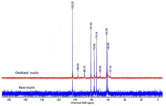 The proton NMR spectra for the oxidized inulin and the product obtained after reacting with carbazate was acquired using the Bruker Avance III 500 NMR, Bruker NMR. Briefly, about 30 mg of modified inulin was dissolved in 0.5 mL of D2O after heating for about 2 min at 80 °C; then, a total of 64 scans was obtained for each sample using the 5 mm NMR probe. In addition, carbon NMR spectra of raw inulin and oxidized inulin in D2O were obtained with Bruker spectrometer (Bruker, Wissembourg, France) using standard pulse sequences. Then, all the spectra obtained were analyzed using the ACD NMR software.