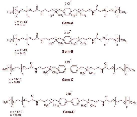 Structures of cationic gemini surfactants (Gem-A to Gem-D) used in this study.