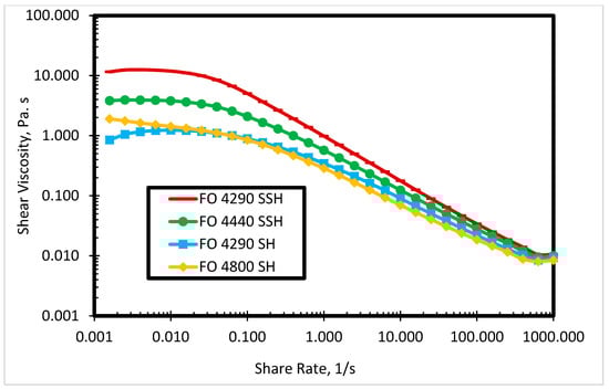 The study of rheological parameters plays a significant role in screening and understanding various SP hybrid systems for cEOR operation. Several investigations have been carried out on the rheological behavior of polymers, surfactants, and the synergy of both. For instance; the study of rheological properties of scleroglucan and N-vinylpyrrolidone polymers [], sodium surfactin [], SP systems comprised of a copolymer of acrylamide and acrylamido tertiary butyl sulfonate and sodium dodecyl sulfate surfactant [], and erucyl dimethyl amidobetaine viscoelastic surfactant and its hybridization with partially hydrolyzed polyacrylamide polymer [].