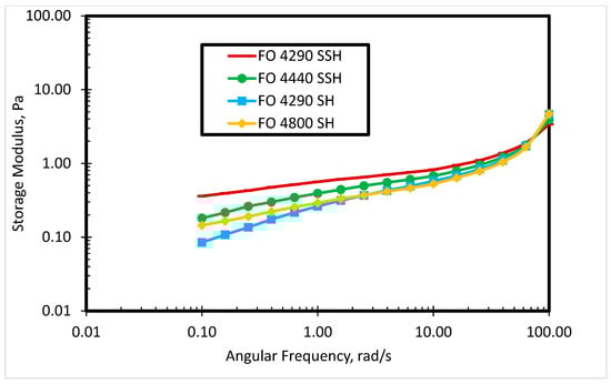 A rheological study of four commercial cationic polyacrylamides was carried out. The molecular weight of each polymer is shown in Table 1. Figure 2 depicts the steady shear viscosity of the polymer solutions in deionized water at 80 °C. The behavior in Figure 2 shows that shear viscosity is dependent on the molecular weight of the polymer. At a lower shear rate (<10 s−1), the high molecular weight polymer has a higher shear viscosity. However, at a higher shear rate, the difference in shear viscosity of the polymer solutions is reduced due to shear dependent viscosities of the polymers. From 0.001 to 0.1 s−1 shear rate, the shear viscosity is constant for each polymer solution, while the shear viscosity is linearly dependent on the shear rate after 0.1 s−1. Figure 3 shows the effect of storage modulus for different polymers at different angular frequencies. At lower angular frequency (<10 rad/s), the storage modulus is higher for the high molecular weight polymer solutions, as presented in Figure 3. Nevertheless, the difference in the storage modulus of polymer solutions is not significant at higher angular frequencies. FO 4290 SSH polymer was selected based on rheological study (highest shear viscosity and storage modulus among four polymer solutions) to combine with several newly synthesized cationic gemini surfactants to produce and analyze novel SP systems for the cEOR processes.