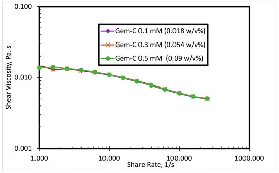 The rheological behavior of the SP solutions having cationic gemini surfactants was evaluated at three different surfactant concentrations (0.1 mM, 0.3 mM, and 0.5 mM) at 80 °C. Four synthesized cationic gemini surfactants with different spacer nature and counterions are used. All surfactants exhibited good thermal stability in seawater with no precipitation. Figure 4 shows the shear viscosity of Gem-C at different concentrations in seawater. The results in Figure 4 show that the shear viscosity of Gem-C did not significantly change by increasing the surfactant concentrations in seawater. The precipitation of surfactants in the seawater was not seen.