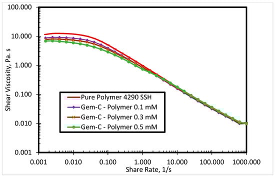 The commercial polymer FO 4290 SSH showed the highest viscosity among all evaluated SP systems. Thus, it was selected to investigate the surfactant-polymer interactions with newly synthesized surfactants. Figure 5 presents the impact of Gem-A surfactant concentration (0.1, 0.3, and 0.5 mM) on the shear viscosity of the SP system at 80 °C. By increasing the surfactant concentration, the polymer viscosity decreases. Both polymers and surfactants used in this research were cationic. The red curve in Figure 5 shows the polymer shear viscosity profile, which is highest among all curves. The higher shear viscosity of the pure polymer is due to the fact that it has no interaction with the surfactant. However, the addition of the surfactant decreases the viscosity of the polymer. The higher the concentration of the surfactant, the greater the reduction in polymer viscosity. A possible explanation for this behavior is that the interactions between anionic counterions of cationic surfactants and cationic polymers result in charge screening, which leads to lower polymer viscosity. Figure 5 shows the behavior of Gem-A, in which chloride is used as an anionic counterion. This reduction in viscosity is only significant at lower shear rates, while all solutions exhibit the same trend at higher shear rates. This is because of the impact of the high shear rate surpassing the charge screening effect. Similar behavior is observed for Gem-C at 0.1, 0.3, and 0.5 mM concentrations, as shown in Figure 6. Gem-B and Gem-D show different behaviors in the higher shear rate region at 0.1, 0.3, and 0.5 mM concentrations, as shown in Figure 7 and Figure 8, respectively. In the higher shear rate region, the SP system viscosity for Gem-B and Gem-D also decreases with increasing surfactant concentrations, unlike Gem-A and Gem-C. The percentage decrease of SP system viscosity is higher for Gem-B and Gem-D compared to Gem-A and Gem-C, as shown in Figure 5, Figure 6, Figure 7 and Figure 8. This means that the charge screening effect is higher in Gem-B and Gem-D.