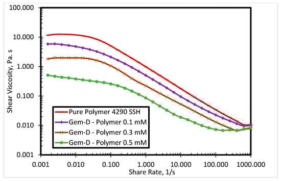 Shear viscosity of 4290 SSH polymer with Gem-D surfactant at different concentrations.